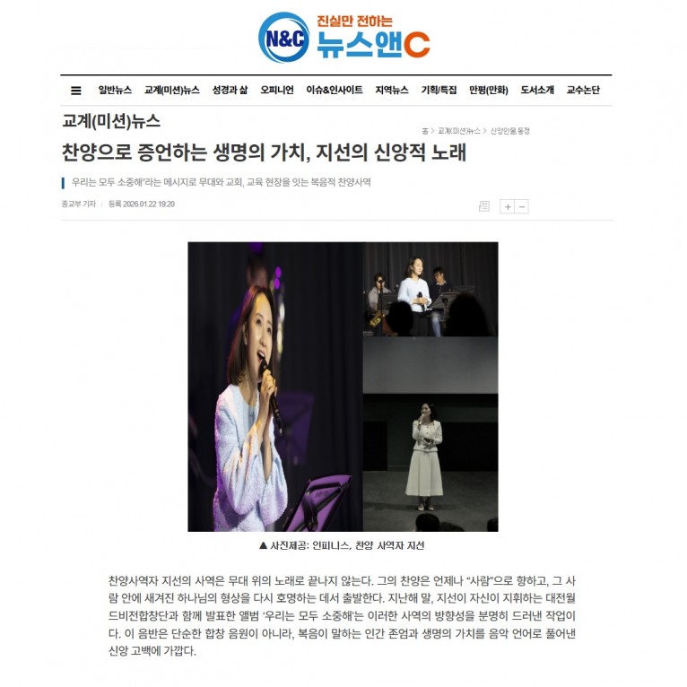 [기사] 찬양으로 증언하는 생명의 가치, 지선의 신앙적 노래(뉴스앤C)