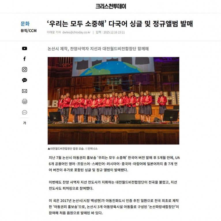 [기사] ‘우리는 모두 소중해’ 다국어 싱글 및 정규앨범 발매(크리스천투데이)